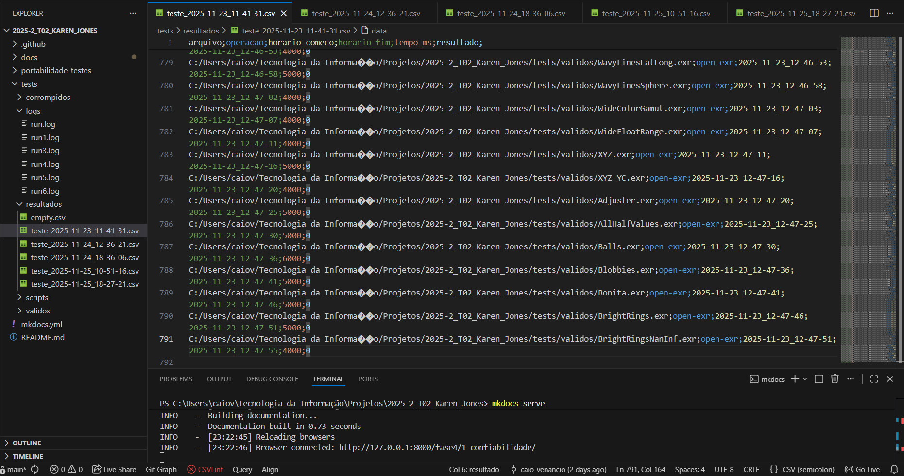Já as métricas 2.2, 3.1, e 3.2, foram feitas testes de forma manual, utilizando manipulação de arquivos validos e corrompidos, presentes respectivamente nas pastas tests/validos e tests/corrompidos.