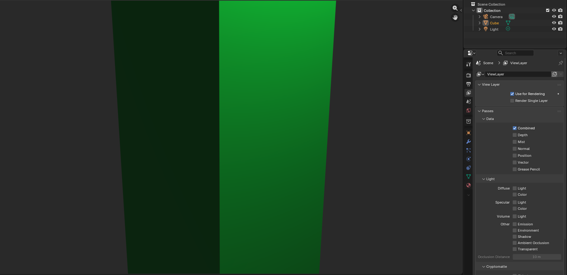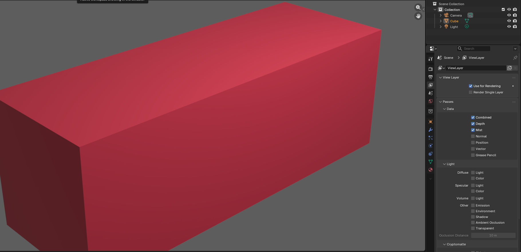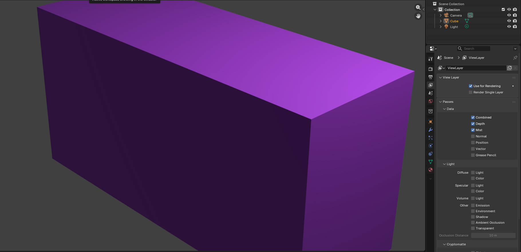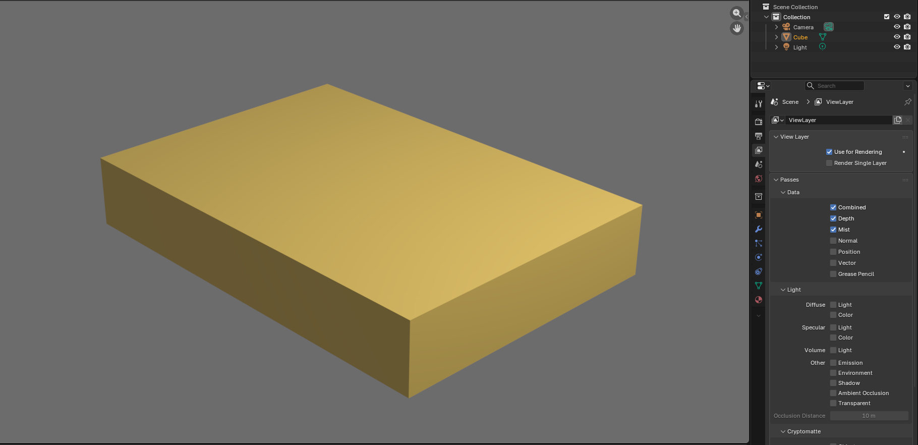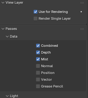 Descrição: Os arquivos de saída do GIMP foram abertos no Blender (utilizando o Image Editor do software). COm isso, a verificação da camada foi realizada ao inspecionar o menu de Passes (canais) para confirmar a presença das camadas Depth e Mist.