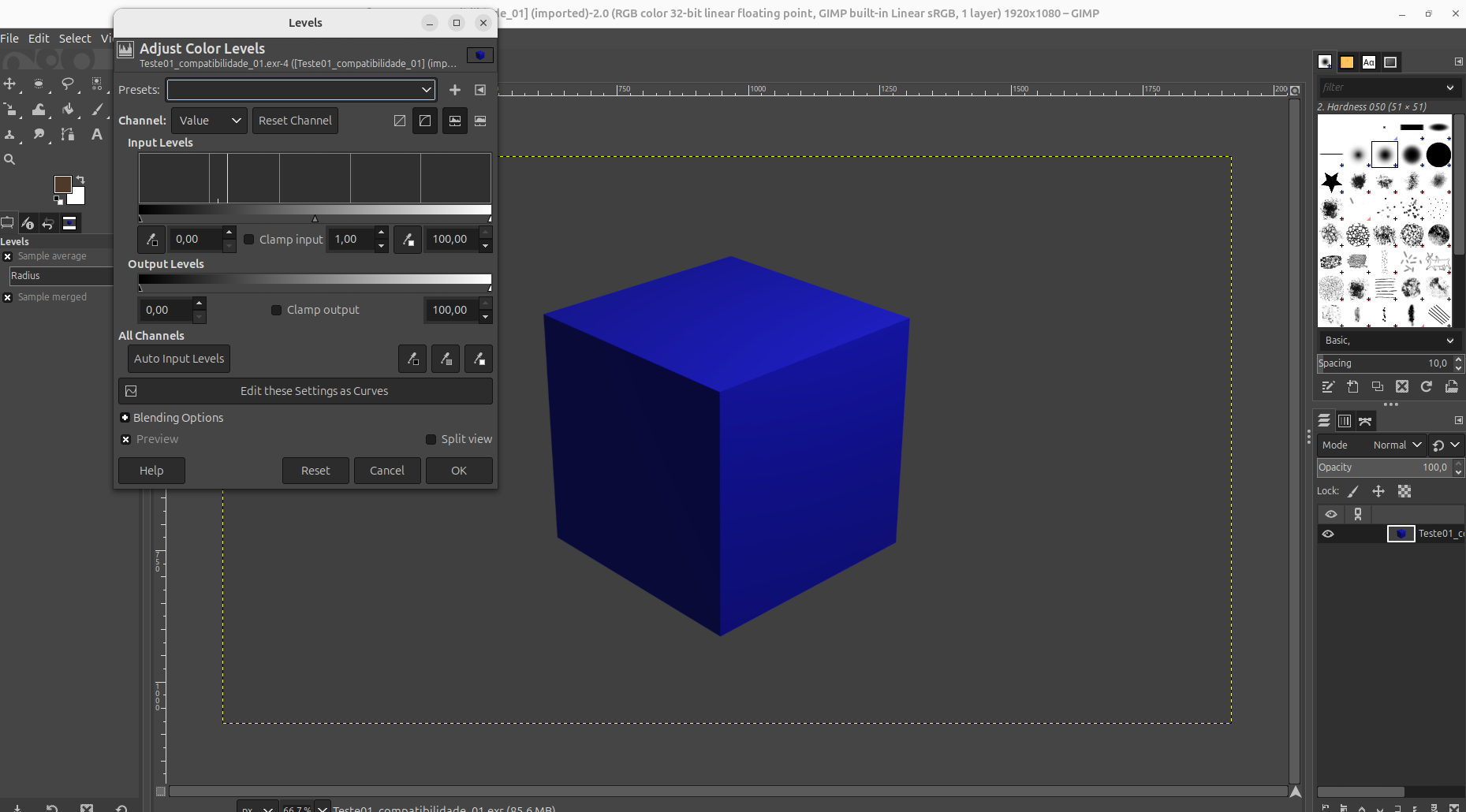 Descrição: Esta etapa teve o objtivo de simular o uso real do GIMP no pipeline de trabalho por um usuário que utiliza um arquivo EXR. Cada um dos cinco arquivos Baseline criados foi aberto no GIMP, e uma edição mínima nos Níveis de Cor foi aplicada para forçar o processamento, e o arquivo foi exportado com a adição de Editada no nome.