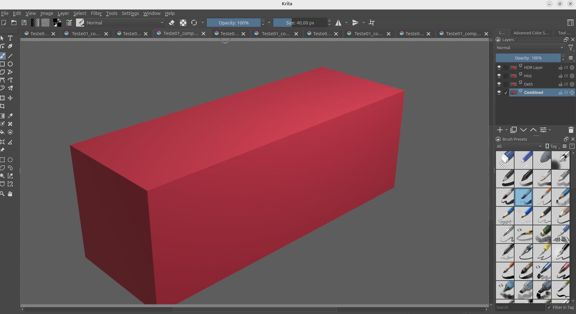 Descrição: Utilizou-se o Blender para gerar um arquivo OpenEXR Multilayer de 1.2 MB. Este arquivo serviu como a carga de teste para simular o cenário de uso real e forçar o processamento do módulo file-exr do GIMP.