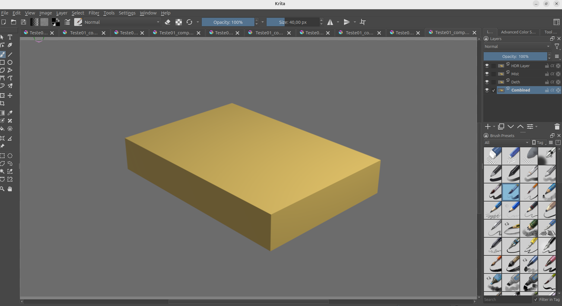 Descrição: O mesmo conjunto de arquivos de saída foi aberto no Krita. A inspeção ocorreu no painel Camadas (Layers) e o resultado confirmou a falha do módulo do GIMP.