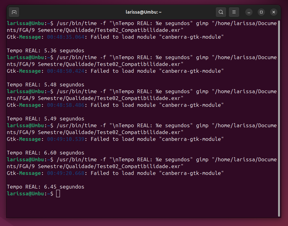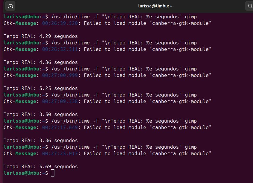 Descrição: Mediu-se o tempo de carregamento (loading time) do GIMP em estado Baseline, ou seja, sem a abertura de nenhum arquivo. Com isso, o comando /usr/bin/time -f "\nTempo REAL: %e segundos" gimp foi executado 6 vezes no Terminal para determinar a média T1.