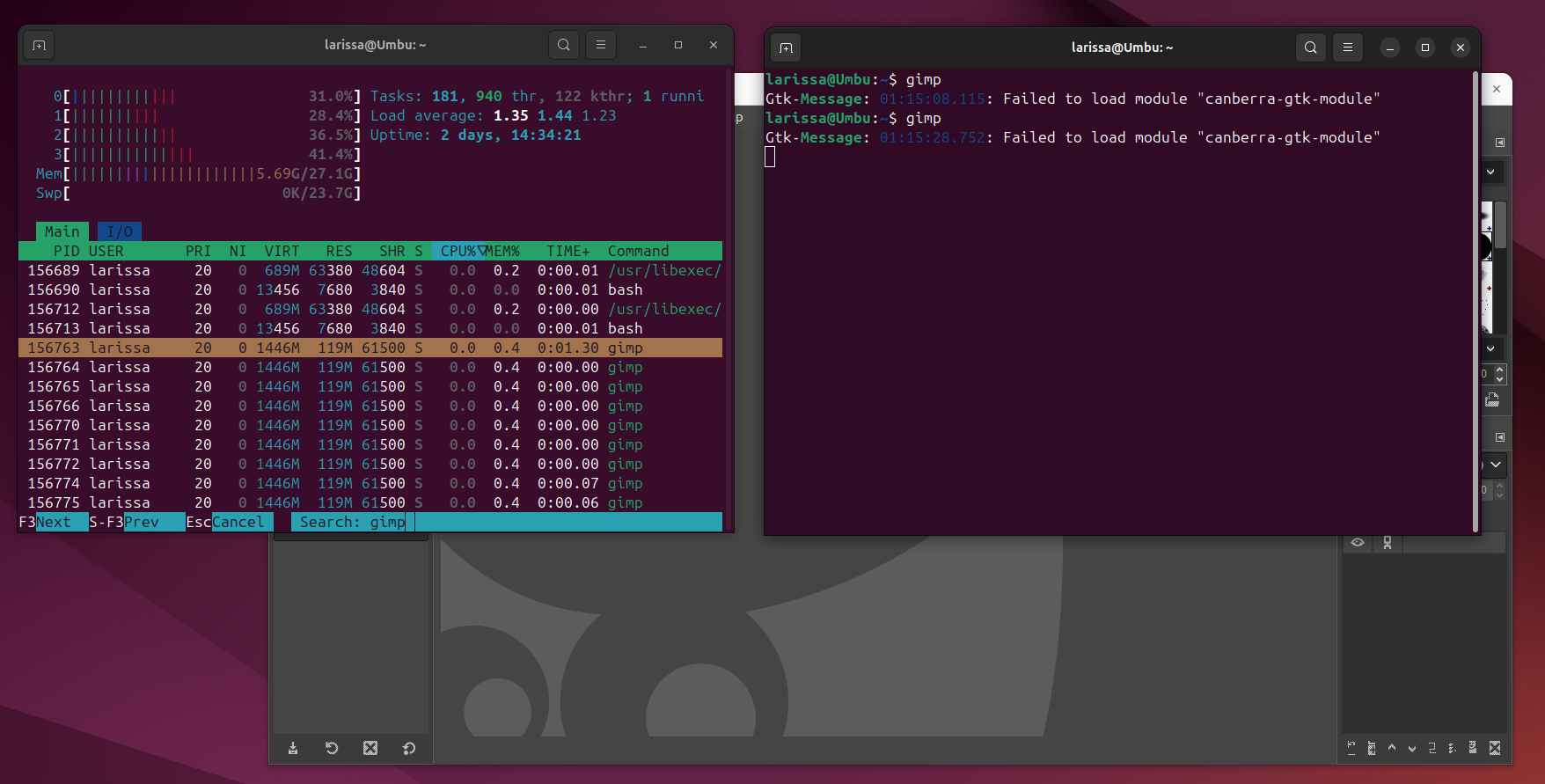 Descrição: Utilizou-se a ferramenta htop no Terminal para monitorar o pico de consumo de memória (Memória Residente - RES) do GIMP ao iniciar sem carregar um arquivo. O processo foi repetido 6 vezes para estabelecer o dado M1.