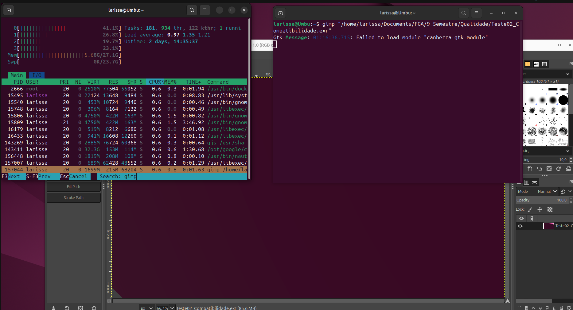 Descrição: Monitorou-se o pico de consumo de memória do GIMP enquanto ele processava o arquivo Teste02_Compatibilidade.exr (Sob Carga). O processo foi repetido 6 vezes, focando no valor RES no htop durante o carregamento do arquivo, para determinar a média M2.